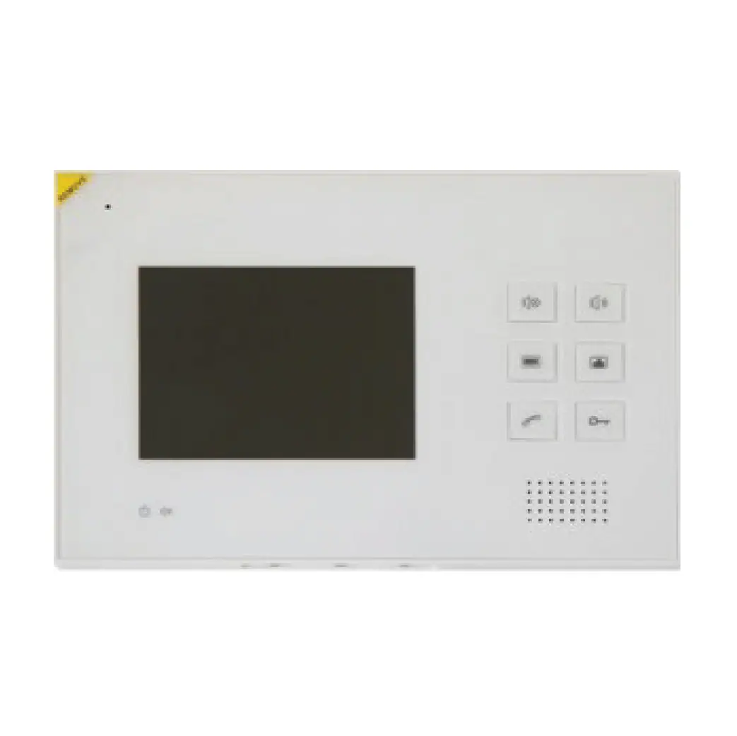 מסך 4.3" צבעוני ללא שפורפרת למערכות אינטרקום טלוויזיה רוזקום התקנה על הטיח באמצעות מתקן תלייה צמוד לקיר. לחצני דיבור ופתיחת השער בקלות