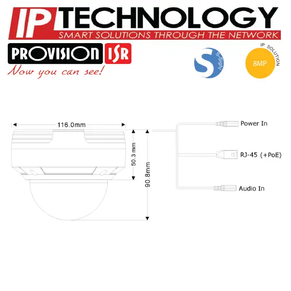 מצלמת כיפה IP להתקנה פנימית וחיצונית (אנטי ונדל) המצוידת בעדשה משתנה רחבה 3.6 מ"מ ברזולוציה של 8MP המיועדת למרחקים קצרים (עד 15M).