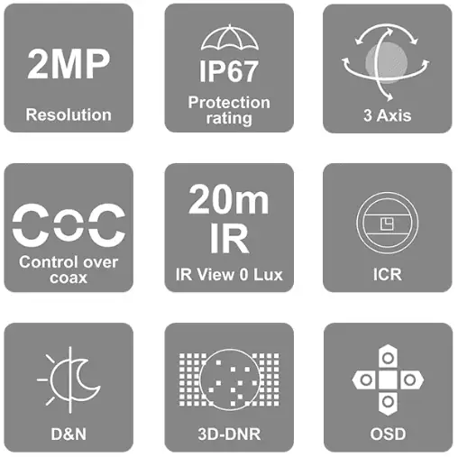 מצלמת כיפה להתקנה פנימית וחיצונית המצוידת בעדשה רחבה 2.8 מ"מ ברזולוציה של 2MP המיועדת למרחקים קצרים (עד 20M). עם טכנולוגיית 4in1 הניתנת לבחירה באמצעות מתג DIP.