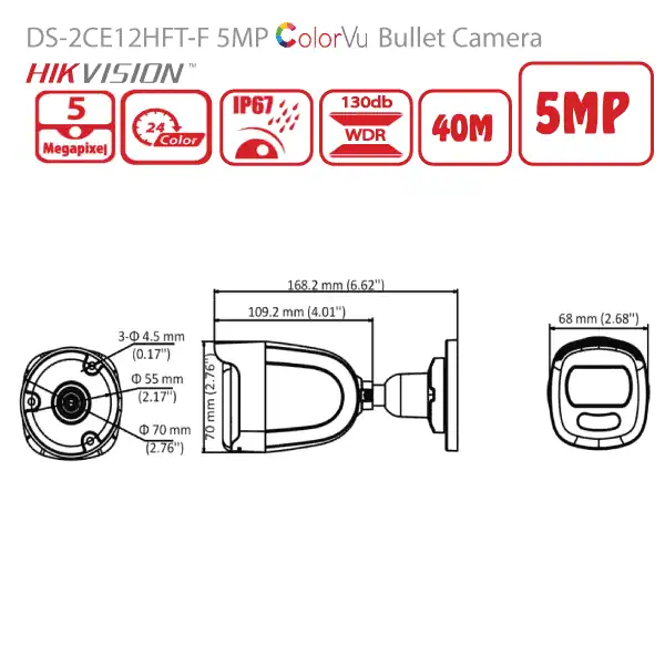 מצלמת צינור 40M ColorVu 5MP דגם DS-2CE12HFT-F