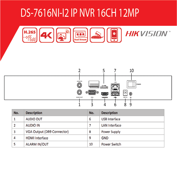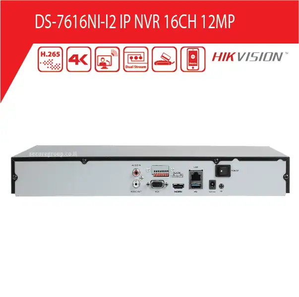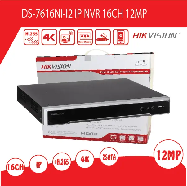 מערכת הקלטה 16 ערוצים HIKVISION NVR דגם DS-7616NI-I2 ברזולוציה 12MP, פורמט דחיסה +H.265