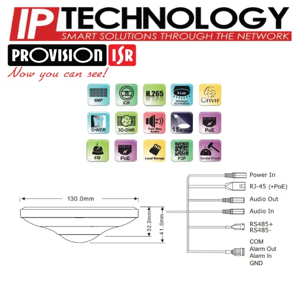 מצלמת FISH EYE אנטי ונדלית FEI-360IP5 v2 מבית Provision-isr, רזולוציה 6MP, עדשה 1.07mm (360°), אודיו in/out, מיקרופון מובנה, כניסת SDCard, חיצונית IP66