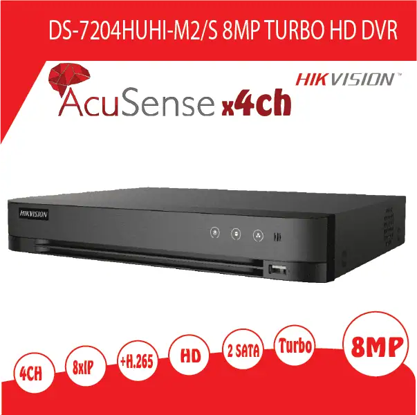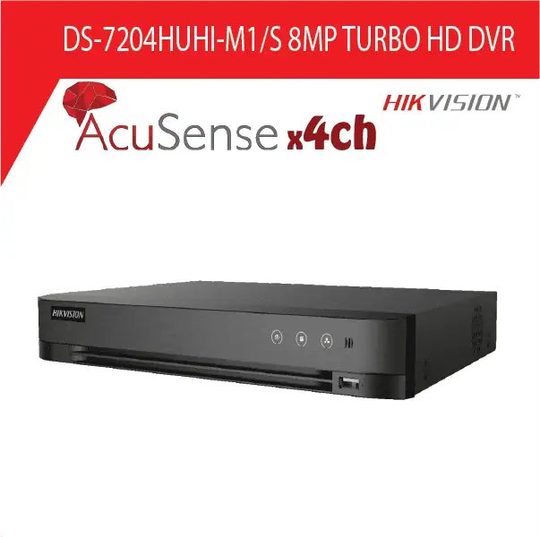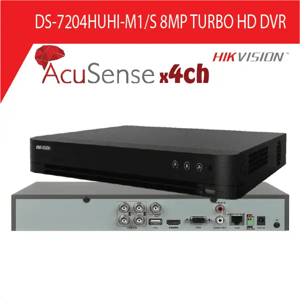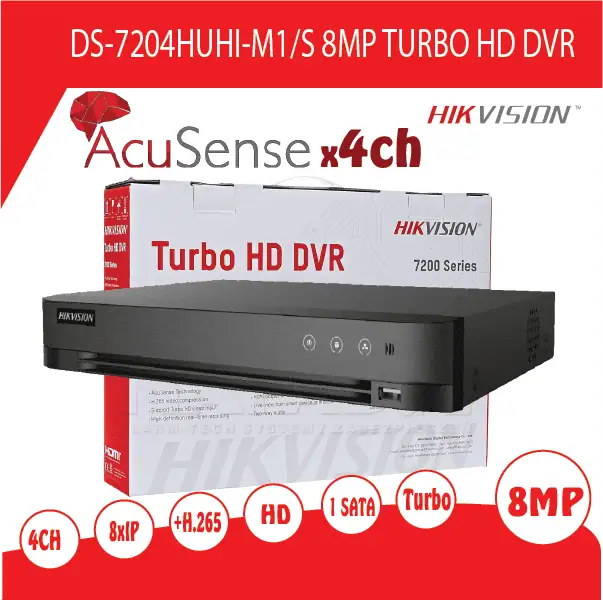 מערכת הקלטה 4 ערוצים HIKVISION DVR דגם DS-7204HQHI-m1 היברידית עד 5 מצלמות IP ברזולוציה 6MP, משולב אנליטיקה בטכנולוגית 2ch AcuSense של HikVision, פורמט דחיסה +H.265