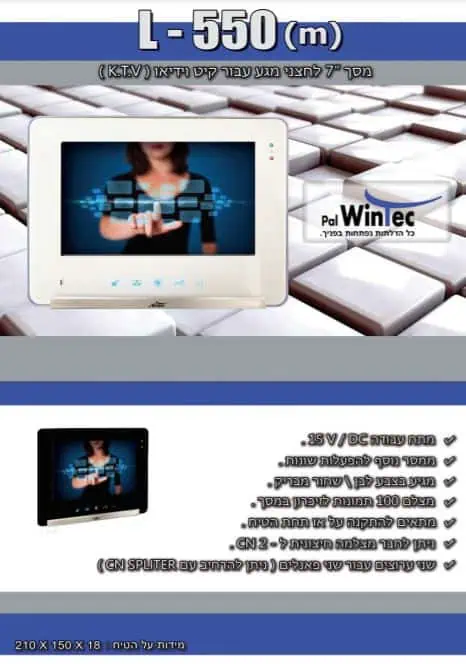 מסך אינטרקום טלוויזיה 7 אינץ' Palwintec L-550 צבעוני ללא שפורפרת בעל צג דקורטיבי ואלגנטי, המתאים למערכת אינטרקום טלווויזיה KTV מבית פאל וינטק. מסך משולב זיכרון פנימי עד 100 תמונות. תפריט פנימי מובנה בעברית המאפשר צפייה בתמונות, שינוי צלצולים, הגדרות שונות