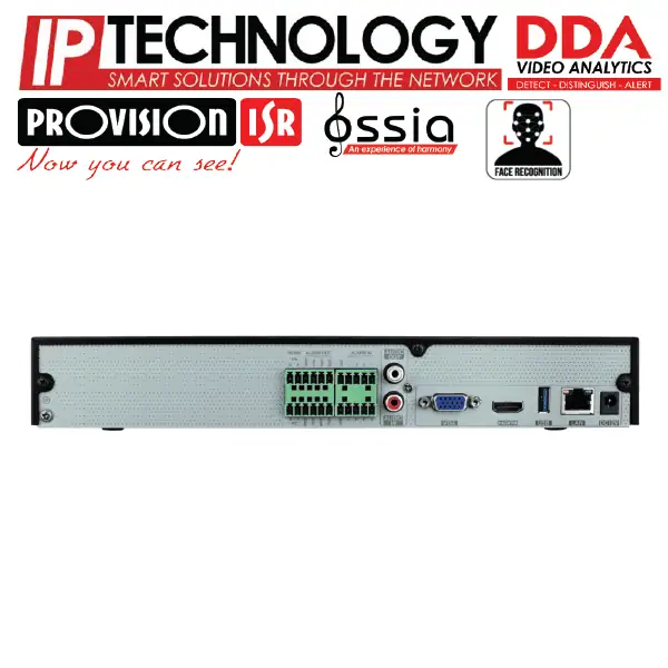 מערכת הקלטה 8 ערוצים PROVISION NVR דגם NVR12-8200FAN רזולוציה 8MP . אנליטיקה מתקדמת DDA, זיהוי פנים. : HDMI (4K,1080P) VGA (1280X1024). דיסק קשיח 1T ניתן להרחבה עד 8TB