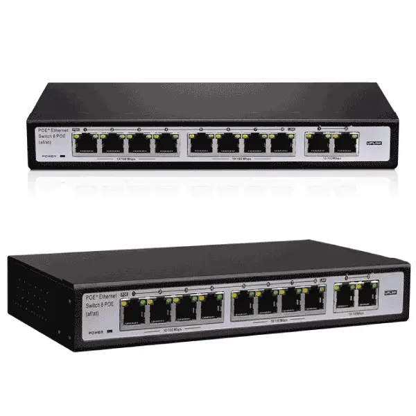 סוויץ' PoE 8+2 מתג 4 פורטים 10/100MMbps עם 2 ערוצי UpLink 100Mbps Port, ספק כוח חיצוני, העברת נתונים עד 100M, מגן ברקים מובנה. CCTV mode