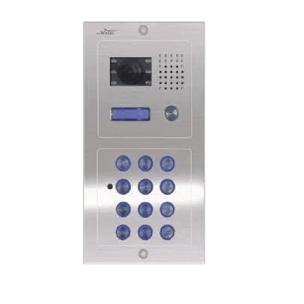 אינטרקום טלוויזיה פאל ווינטק דגם VEGA 214 KTV חיצוני המורכב מודול לחצן מואר ומצלמה לראיית לילה צבעונית ומודול קודן מואר לפתיחת דלת באמצעות קוד. עשוי מנירוסטה לא מחלידה, מוגן מין ומותאם להתקנה תחת הטיח או על הטיח באמצעות קופסת התאמה